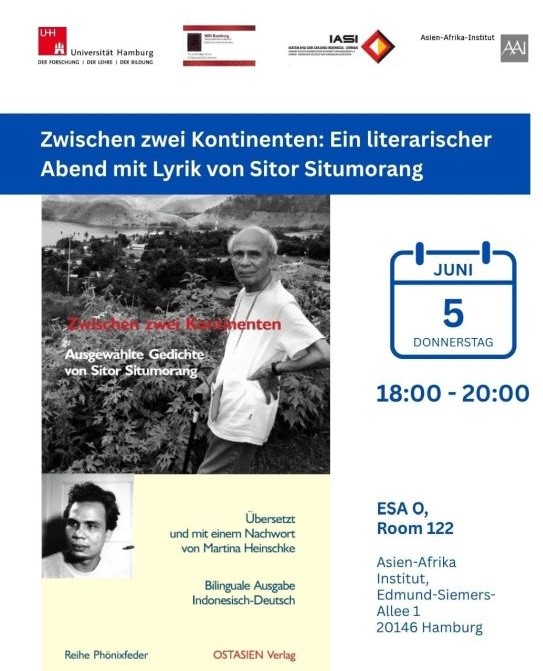 (InMaOn) Am 05. Juni 2025 (18 bis 20 Uhr) lädt das Asien-Afrika-Institut (AAI) in Hamburg zu einem Literaturabend mit der Übersetzerin und Indonesistin Dr. Martina Henschke ein. Es geht um die Vorstellung ihres neusten Buches mit Übersetzungen von Gedichten des indonesischen Lyrikers Sitor Situmorang. Die Veranstaltung wird begleitet von Live-Musik einer Batak-Gruppe aus Nord-Sumatra (…). ... zur Veranstaltung