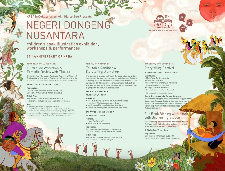 (InMaOn /JH) Vom 04. bis 20. August feiert die Gesellschaft KPBA (Kelompok Pencinta Bacaan Anak) in Zusammenarbeit mit Dia.Lo.Gue Artspace ihren 30. Jahrestag in Jakarta – ein internationales Erzählfestival präsentiert unter dem Motto »Negeri Dongeng Nusantara «.