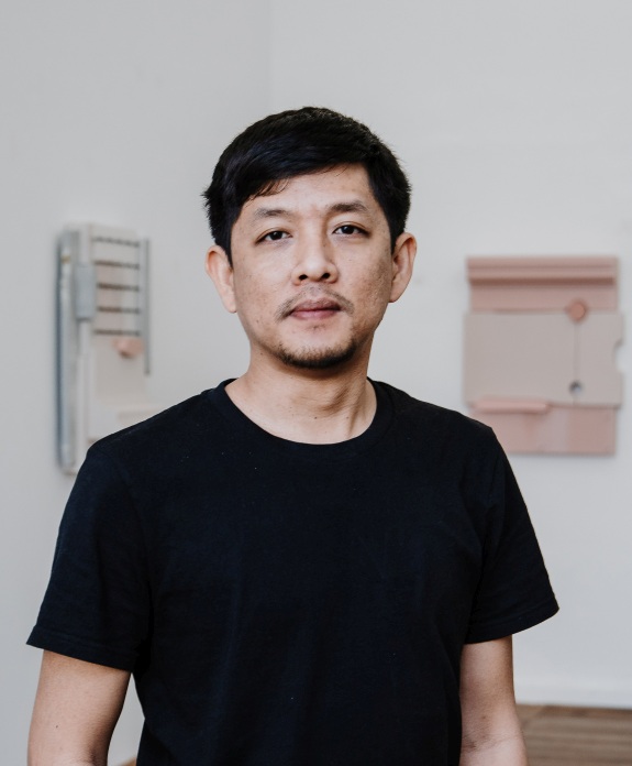 In seinen einzigartigen plastischen Werken setzt sich der indonesische Künstler auf komplexe Weise mit Raum und Materialität auseinander. Ihre zahlreichen Ebenen changieren zwischen beruhigten Flächen, geraden Kanten und dynamischen Formen. Die aus Werkstoffen wie Plexiglas, Stahl und Holzplatten gefertigten Objekte öffnen einen spannungsvollen Dialog zwischen scheinbar ebenmäßig-industrieller Produktion und zuweilen organisch anmutender, individueller Handarbeit. Die Sichtbarmachung dieses Entstehungsprozesses spielt dabei eine große Rolle: Neben gleichmäßigen Einfärbungen tauchen wiederholt Irritationen wie unbeabsichtigt wirkende Leerstellen und gestische Farbspuren auf, die in ihrer Brüchigkeit und Ungleichmäßigkeit auf malerische Weise wie Vor- oder Nachstufen der Perfektion anmuten, Assoziationen aufrufen und vom Menschen als Schöpfer erzählen. In der maschinellen Präzision verwandelt sich das menschlich Warme so zu einem spiegelnden Konsum – Interface.