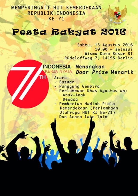 Am 13. August, vier Tage vor dem Unabhängigkeitstag der Republik Indonesiens, findet ein gesellschaftlich-kulturelles Fest in der Residenz des Botschafters S.E. Dr. Dipl. Ing. Fauzi Bowo und seiner Frau Sri Hartati statt. Die Einladung richtet sich an die indonesische Community in ganz Deutschland, aber auch an alle Freunde Indonesiens. Die Veranstaltung wird durch ein Bühnen- und Informationsprogramm verfeinert: Es gibt Musikalisches und Kulinarisches, einen Bazaar und auch in diesem Jahr wieder tolle Preise bei der Tombola zu gewinnen.