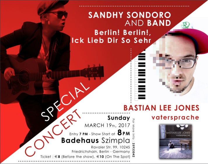 Der indonesische Superstar mit Gitarre, Sandhy Sondoro (in Deutschland durch Stefan Raab bekannt) trifft auf den Crack am Klavier, Bastian Lee Jones (bester Deutscher Songwriter in England 2008 und 2009 UK Songwriting Contest). Beide schreiben und singen auf Indonesisch, Englisch und Deutsch und geben am 19. März ein gemeinsames Konzert im Badehaus Berlin.