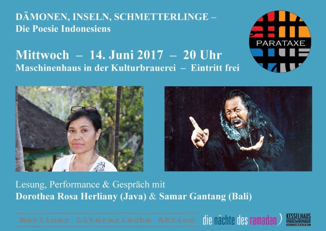 Die Nächte des Ramadan & Berliner Literarische Aktion e.V. präsentieren am 14. Juni um 20 Uhr im Maschinenhaus der Kulturbrauerei einen PARATAXE Weltliteratursalon extra: »Dämonen, Inseln, Schmetterlinge - die Poesie Indonesiens«. Ein Abend mit der Dichterin Dorothea Rosa Herliany (Java) und dem Performance-Poeten Samar Gantang (Bali).