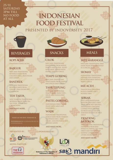 On stage performances (04:00 PM - 10:00 PM): - Karinding Attack (bamboo heavy metal band) - Audijens Yen (a German rapper who sings in Indonesian) - Fashion Show - Traditional Indonesian dances: from different regions such as Jawa Barat, Aceh, and Bali - Pencak Silat Sigepi: traditional Indonesian martial art - Five Indo-Berlin bands with different genres - Angklung Berlin: traditional bamboo music instruments played together as an orchestra - Cezz Tribe: duo guitarists - Janne Timmer: solo piano performance - Neeraja Narayanasamy: solo guitar performance - DJ performance by DJ Magus |