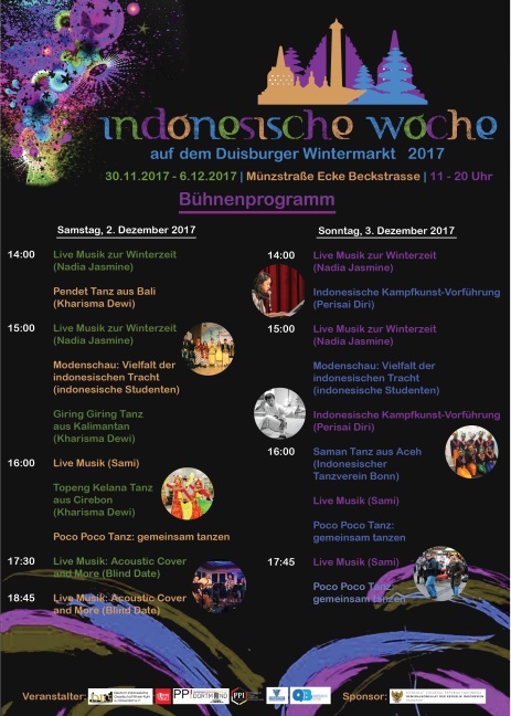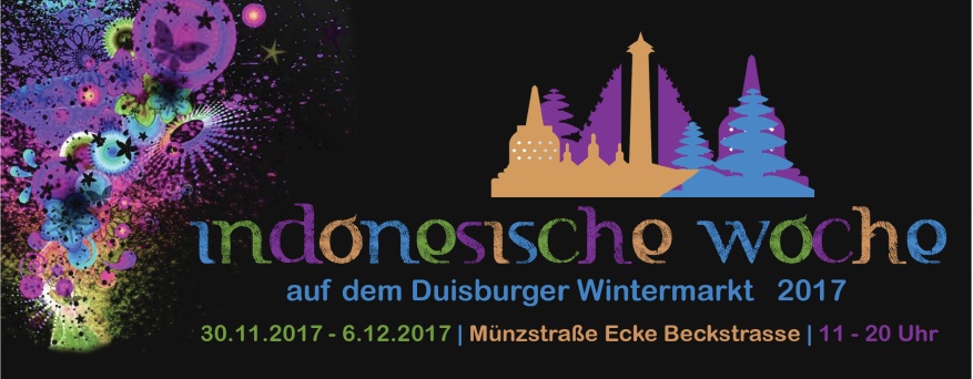 Dieses Jahr wird es auf dem Duisburger Wintermarkt zum zweiten Mal eine Indonesische Woche geben, vom 30.11.2017 bis zum 06.12.2017, täglich von 11:00 bis 20:00 Uhr.