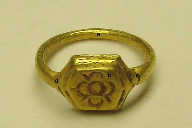 Fingerring mit einer vierblättrigen eingravierten Blume auf sechseckigem Ringkopf; Sammlung: Weltkulturen Museum, Frankfurt am Main; Bildquelle: Weltkulturen Museum