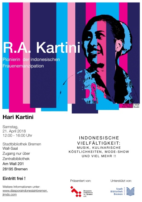 Der Verein Diaspora Indonesia in Bremen e.V. feiert am 21. April 2018 von 12 bis 16 Uhr, mit der Unterstützung der Stadtbibliothek Bremen, den indonesischen Nationalfeiertag für die Gleichberechtigung der Frauen, den »Hari Kartini«. Lesen Sie dazu auch den Beitrag über R.A. Kartini, die Pionierin der indonesischen Frauenemanzipation.