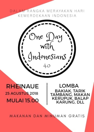 Am 25. August 2018 veranstaltet die indonesische Studentenvereinigung PPI Bonn eine Pesta Rakyat unter dem Motto »One day with Indonesians 4.0«. Die Veranstaltung ist sozusagen eine Nach-Unabhängigkeits-Feier (Republik Indonesia Kemerdekaan 73) mit Spielen, Essen und anderer Unterhaltung.