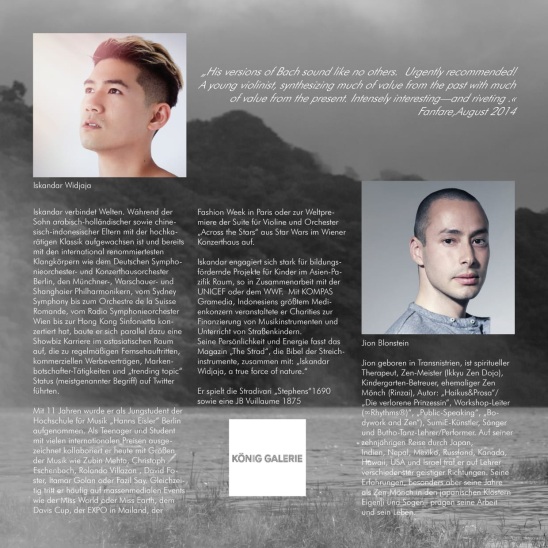 Iskandar Widjaja verbindet Welten. Während der Sohn arabisch-holländischer sowie chinesisch-indonesischer Eltern mit der hochkarätigen Klassik aufgewachsen ist und bereits mit den international renommiertesten Klangkörpern wie dem Deutschen Symphonieorchester- und Konzerthausorchester Berlin, den Münchner-, Warschauer- und Shanghaier Philharmonikern, vom Sydney Symphony bis zum Orchestre de la Suisse Romande, vom Radio Symphonieorchester Wien bis zur Hong Kong Sinfonietta konzertiert hat, baute er sich parallel dazu eine Showbiz Karriere im ostasiatischen Raum auf, die zu regelmäßigen Fernsehauftritten, kommerziellen Werbeverträgen, Markenbotschafter-Tätigkeiten und »trending topic« Status (meistgenannter Begriff) auf Twitter führten. Mit 11 Jahren wurde er als Jungstudent der Hochschule für Musik »Hanns Eisler« Berlin aufgenommen. Als Teenager und Student mit vielen internationalen Preisen ausgezeichnet kollaboriert er heute mit Größen der Musik wie Zubin Mehta, Christoph Eschenbach, Rolando Villazon , David Foster, Itamar Golan oder Fazil Say. Gleichzeitig tritt er häufig auf massenmedialen Events wie der Miss World oder Miss Earth, dem Davis Cup, der EXPO in Mailand, der Fashion Week in Paris oder zur zur Weltpremiere der Suite für Violine und Orchester „Across the Stars“ aus Star Wars im Wiener Konzerthaus auf. Iskandar engagiert sich stark für bildungsfördernde Projekte für Kinder im Asien-Pazifik Raum, so in Zusammenarbeit mit der UNICEF oder dem WWF. Mit KOMPAS Gramedia, Indonesiens größtem Medienkonzern veranstaltete er Charities zur Finanzierung von Musikinstrumenten und Unterricht von Straßenkindern. Seine Persönlichkeit und Energie fasst das Magazin »The Strad«, die Bibel der Streichinstrumente, zusammen mit: „Iskandar Widjaja, a true force of nature.“ Er spielt die Stradivari »Stephens« 1690 sowie eine JB Vuillaume 1875.