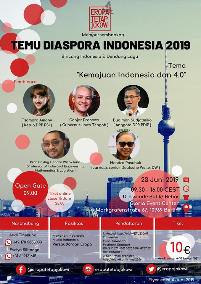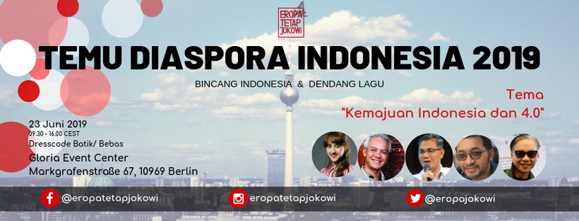 Bei der Veranstaltung am 23. Juni in Berlin haben Sie die Möglichkeit mit Personen aus der indonesischen Diaspora ganz Europas zusammenzukommen, verschiedene Vorträge zu hören und in direkten Dialog zu treten. Thema der Veranstaltung: »Kemajuan Indonesia 4.0« (Fortschritt Indonesiens 4.0)