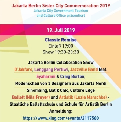 Im Rahmen des 25jährigen Städtepartnerschaftsjubiläum zwischen Berlin und Jakarta 2019 präsentiert das Tourismus- und Kulturbüro der Stadtverwaltung von Jakarta in Zusammenarbeit mit der Senatskanzlei Berlin einen Abend mit Tanz, Musik und Mode. Freunde der indonesischen Kultur sind zu dieser Veranstaltung eingeladen.
