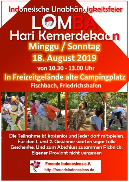 Am 18. August 2019 feiern die Freunde Indonesiens e.V. den Unabhängigkeitstag Indonesiens am Bodensee, mit in Indonesien typischen und lustigen ‚17-Agustusan‘-Spielen.