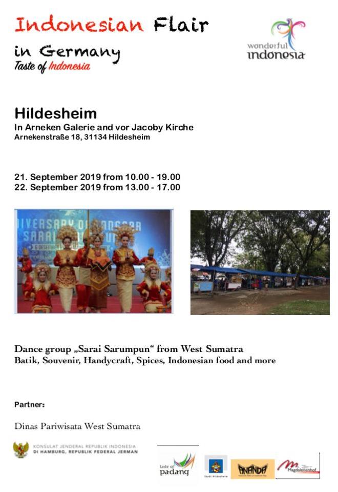 Am 21 und 22.09.2019 wird sich die Partnerstadt Padang in Hildesheim vorstellen, wobei auch Präsentationen einiger anderer der vielen Hundert Kulturen Indonesiens geplant sind. Neben z.B. Tänzen aus Westsumatra wird es weitere künstlerische, kulturelle und kulinarische Momente geben in und vor der Arneken Galerie.