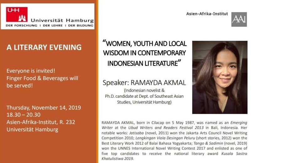 Einladung zu einem Literaturabend mit Ramayda Akmal, Schriftstellerin und derzeit als Doktorandin am Asien-Afrika-Institut (AAI) der Universität Hamburg.