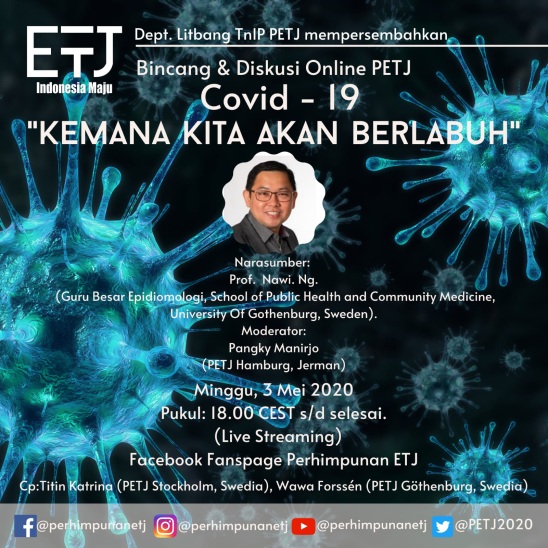 Am 03. Mai lädt die Organisaton Perhimpunan Eropa untuk Indonesia Maju (PETJ), Departemen Latihan dan Pengembangan Teknologi dan Ilmu Pengetahuan (Litbang TnIP) / (Vereinigung der Indonesier in Europa für den Fortschritt Indonesiens, Abteilung für Training und Entwicklung in den Bereichen Technologie und Wissenschaft) zu einer Onlineveranstaltung über die Auswirkungen der Corona-Pandemie ein.