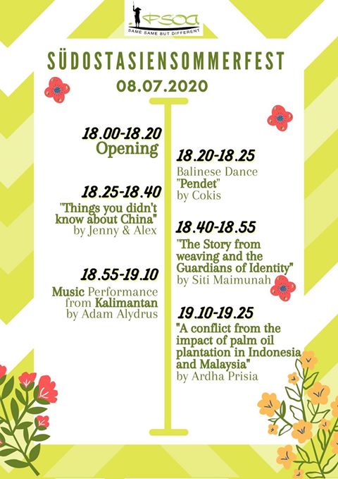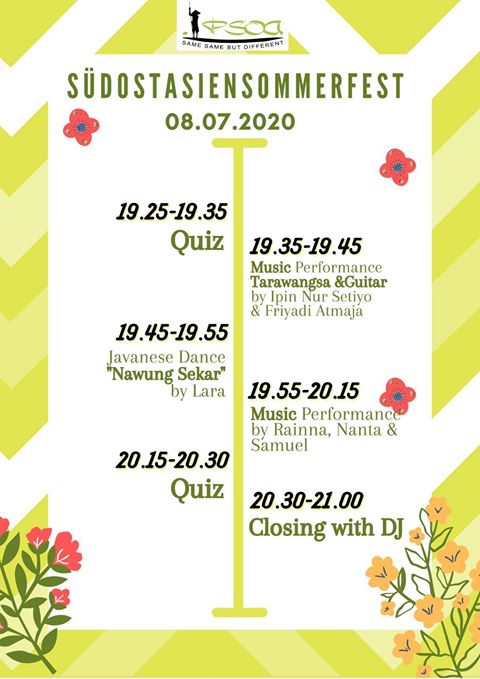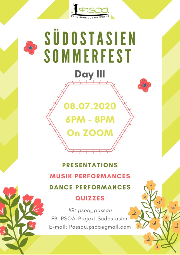 Die Hochschulgruppe der Universität Passau »Projekt-Südostasien«, kurz PSOA, veranstaltet auch 2020 wieder ein Sommerfest. Aufgrund der Corona-Beschränkungen findet die Feier diesmal auf Zoom statt. Veränderte Zeiten bringen neue Formate. So haben Südostasien-Begeisterte die Möglichkeit von überall den Veranstaltungen beizuwohnen, ob derzeit in Passau, irgendwo anders in Deutschland / Europa oder in Südostasien verweilend. Jeder kann dabei sein!