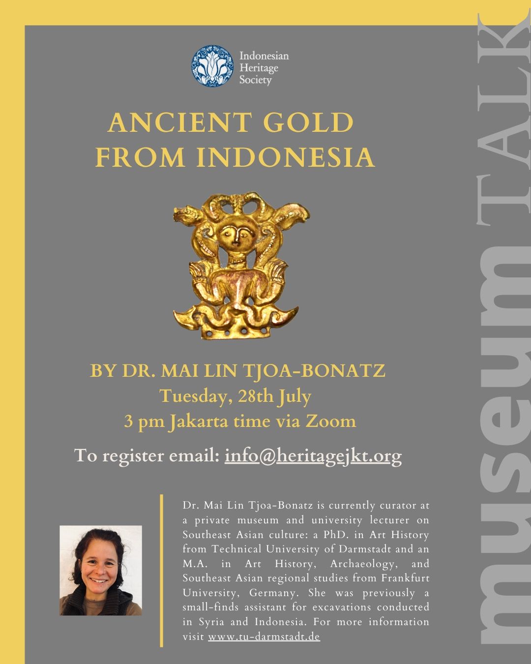Am 28. Juli 2020 lädt die Indonesian Heritage Society (IHS) zu einem Webinar mit Dr. Mai Lin Tjoa-Bonatz ein. Die Referentin wird einen Vortrag zum Thema »Ancient Gold from Indonesia« halten. Die Veranstaltung wird etwa eine Stunde dauern. Anschließend wird es eine Diskussion geben, moderiert von Anya Robertson (IHS).