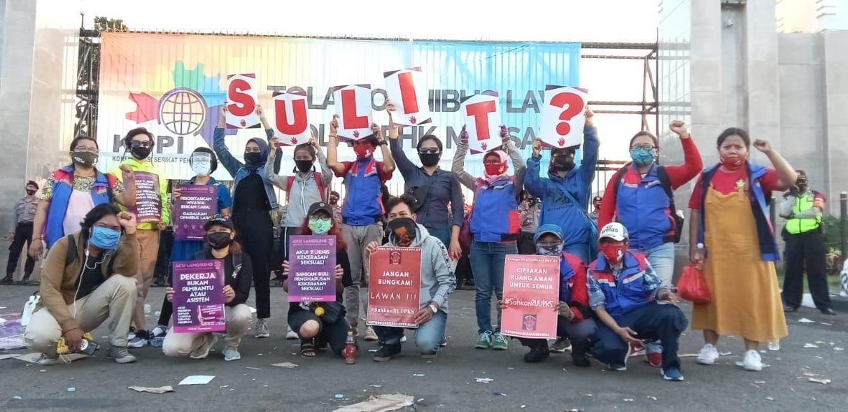 Gewerkschafter*innen protestieren gegen die Streichung des Gesetzentwurfs zur Beseitigung sexueller Gewalt von der parlamentarischen Abstimmungsliste; Bildquelle: ©Factory Labourer‘s Federation/Confederation of Indonesian Workers Unions / zur Verfügung gestellt von Watch Indonesia e.V.