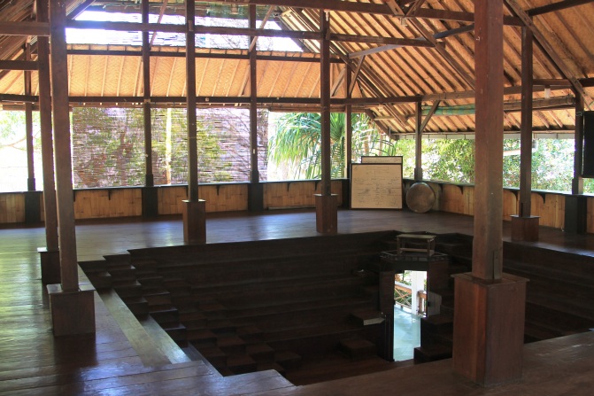 Ruang seminar (Aula). Zentraler, offen gestalteter Ort der Anlage in PPLH Puntondo; errichtet in Zusammenarbeit mit dem Architekten Hans-Ulrich Fuhrke; Bildquelle: ©Jörg Huhmann / InMaOn