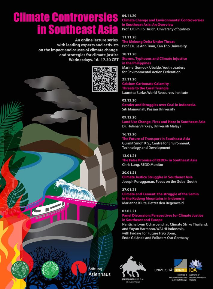 Die historische Verantwortung für die globale Erwärmung, die die Zukunft der Menschen in Südostasien bedroht, liegt bei Europa und Nordamerika. Gleichzeitig forcieren die Regierungen der Länder Südostasiens eine Entwicklung, die auf beschleunigtem Wachstum und Ausbeutung der natürlichen Ressourcen beruht - und verschärfen damit die Klimakrise. In dieser Vortragsreihe werden Experten und Aktivisten aus und über Südostasien die Auswirkungen des Klimawandels auf die Region analysieren, die sozio-ökologische Transformation wichtiger Sektoren (wie Energie, Landwirtschaft oder Mobilität) diskutieren und die Herausforderungen und Strategien der Bewegung für Klimagerechtigkeit erörtern.