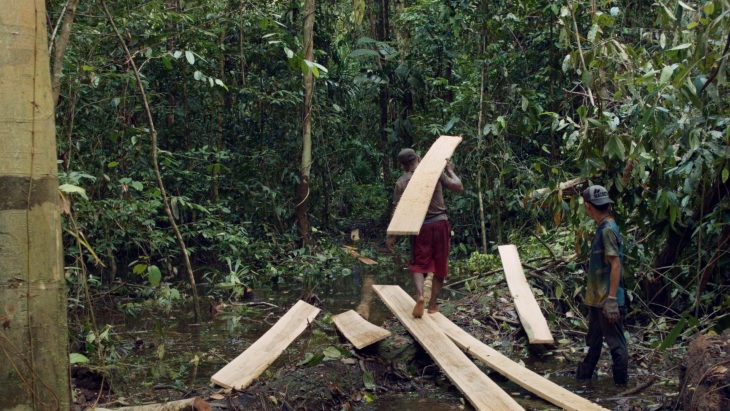 Die ruhige Beobachtung im Wechselspiel zwischen durchdringenden Motorsägen-Geräuschen und Momenten friedlicher Stille, endet mit dem beschwerlichen Transport des Holzes aus dem Wald. Wer weiterdenkt, weiß, dass es als Mahagoni-Tisch oder Bangkirai-Diele auch in unseren Wohnungen landen könnte (…).