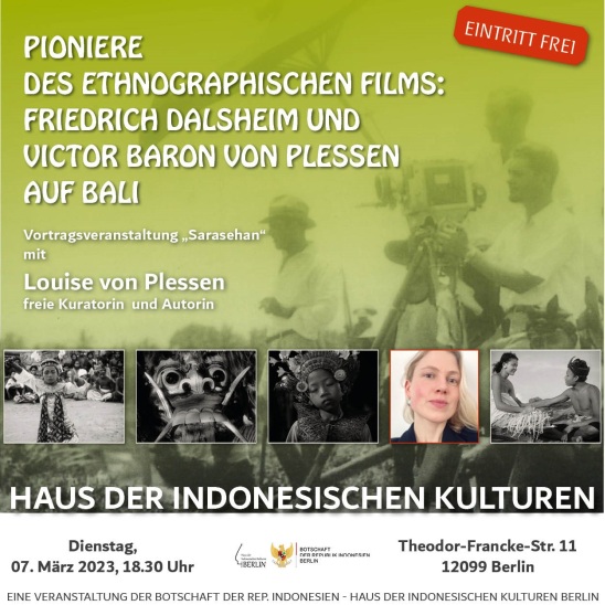 Am 07. März 2023 lädt das Haus der Indonesischen Kulturen in Berlin (RBI) zu einem Vortrag + Buchvorstellung mit Louise von Plessen ein. Thema der Veranstaltung: »Pioniere des ethnographischen Films – Friedrich Dalsheim und Victor Baron von Plessen auf Bali«.