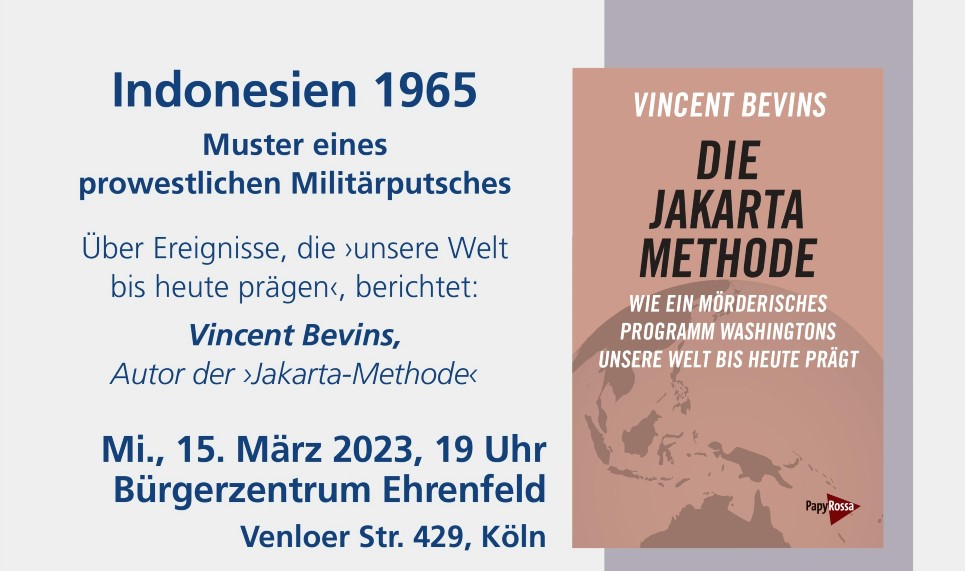 »1965 gab es in Indonesien einen Umsturz durch das Militär. Dahinter stand der Kampf gegen den Kommunismus, wesentlich befördert durch die USA. Dabei kam es zu Massakern mit etwa 1,5 Millionen Toten. Mit diesem Putsch gegen die antikoloniale Sukarno-Regierung durch den Armee-General Suharto galt es, Indonesien auf prowestlichen Kurs zu bringen. Untermauert mit neu veröffentlichten Dokumenten und zahlreichen Zeitzeugen-Interviews, zeigt der US-amerikanische Publizist Vincent Bevins auf: Mit der Chiffre "Jakarta" diente Indonesien 1965 als Blaupause für US-gestützte Staatsstreiche insbesondere in Lateinamerika. Bevins macht das Ausmaß der Gewalt deutlich, mit der der Kalte Krieg im globalen Süden geführt wurde. Ob in Indonesien, den Philippinen, in Chile, Argentinien oder in El Salvador: Revolutionäre Politiken wurden mit allen Mitteln vereitelt – in Indonesien auch unter bundesdeutscher Mitverantwortung.« Veranstalterinfo Auf dem Podium: