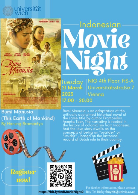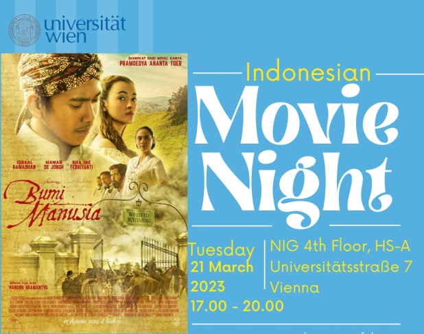 Das Institut für Kultur- und Sozialanthropologie an der Universität Wien zeigt die Filmadaption Bumi Manusia von Regisseur Hanung Bramantyo. Der Film basiert auf dem gleichnamigen Roman-Klassiker von Pramoedya Ananta Toer, der vielleicht bedeutendste und wichtigste indonesische Schriftsteller des 20. Jahrhunderts. Der historische Roman Bumi Manusia ist der erste Teil seiner berühmten Buru-Tetralogie.