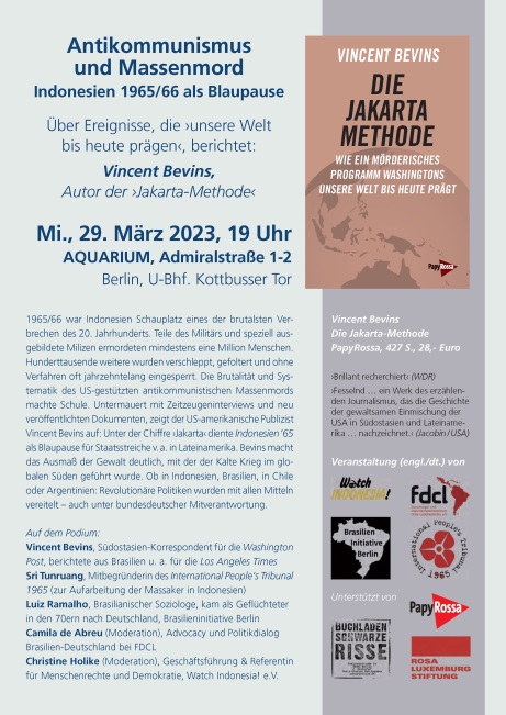 Eine gemeinsame Veranstaltung (engl./dt.) von Watch Indonesia! e.V., International People’s Tribunal 1965, Brasilien Initiative Berlin (BIB) und FDCL – Forschungs- und Dokumentationszentrum Chile-Lateinamerika e.V.