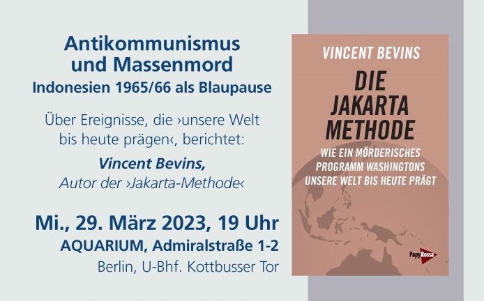 »1965/66 war Indonesien Schauplatz eines der brutalsten Ver brechen des 20. Jahrhunderts. Teile des Militärs und speziell ausgebildete Milizen ermordeten mindestens eine Million Menschen. Hunderttausende weitere wurden verschleppt, gefoltert und ohne Verfahren oft jahrzehntelang eingesperrt. Die Brutalität und Systematik des US-gestützten antikommunistischen Massenmords machte Schule. Untermauert mit Zeitzeugeninterviews und neu veröffentlichten Dokumenten, zeigt der US-amerikanische Publizist Vincent Bevins auf: Unter der Chiffre ›Jakarta‹ diente Indonesien ’65 als Blaupause für Staatsstreiche v. a. in Lateinamerika. Bevins macht das Ausmaß der Gewalt deutlich, mit der der Kalte Krieg im globalen Süden geführt wurde. Ob in Indonesien, Brasilien, in Chile oder Argentinien: Revolutionäre Politiken wurden mit allen Mitteln vereitelt – auch unter bundesdeutscher Mitverantwortung.« Einführende Zeilen vom Veranstalter |