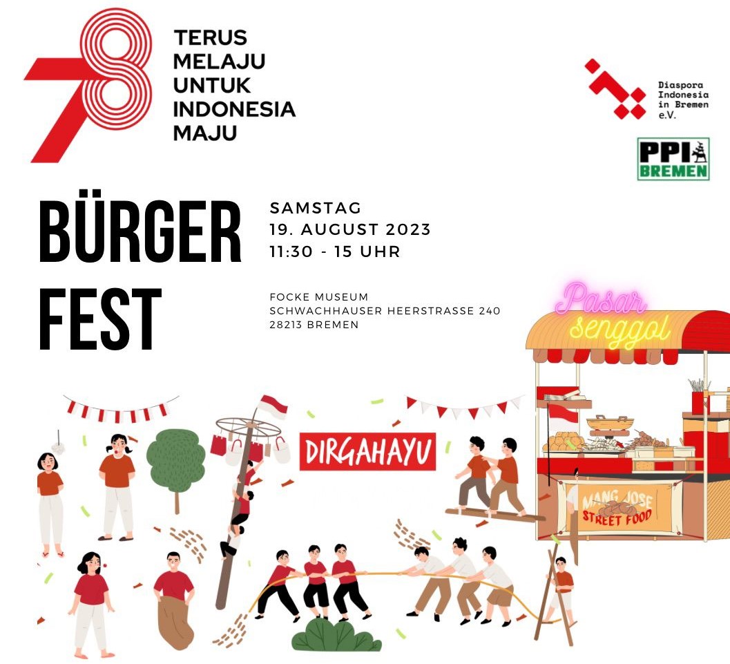 Anlässlich der Feierlichkeiten zum 78. Jahrestag der indonesischen Unabhängigkeit (17.08.1945) lädt die Diaspora Indonesia in Bremen e.V. zu einem Bürgerfest (Pesta Rakyat) ein. Das Fest findet am 19. August 2023 im Park des Focke-Museums statt. Präsentiert wird ein buntes Unterhaltungsprogramm mit Tänzen und musikalischen Darbietungen, wie z.B. die Bremer Dangdut-Band Bojo Galak.