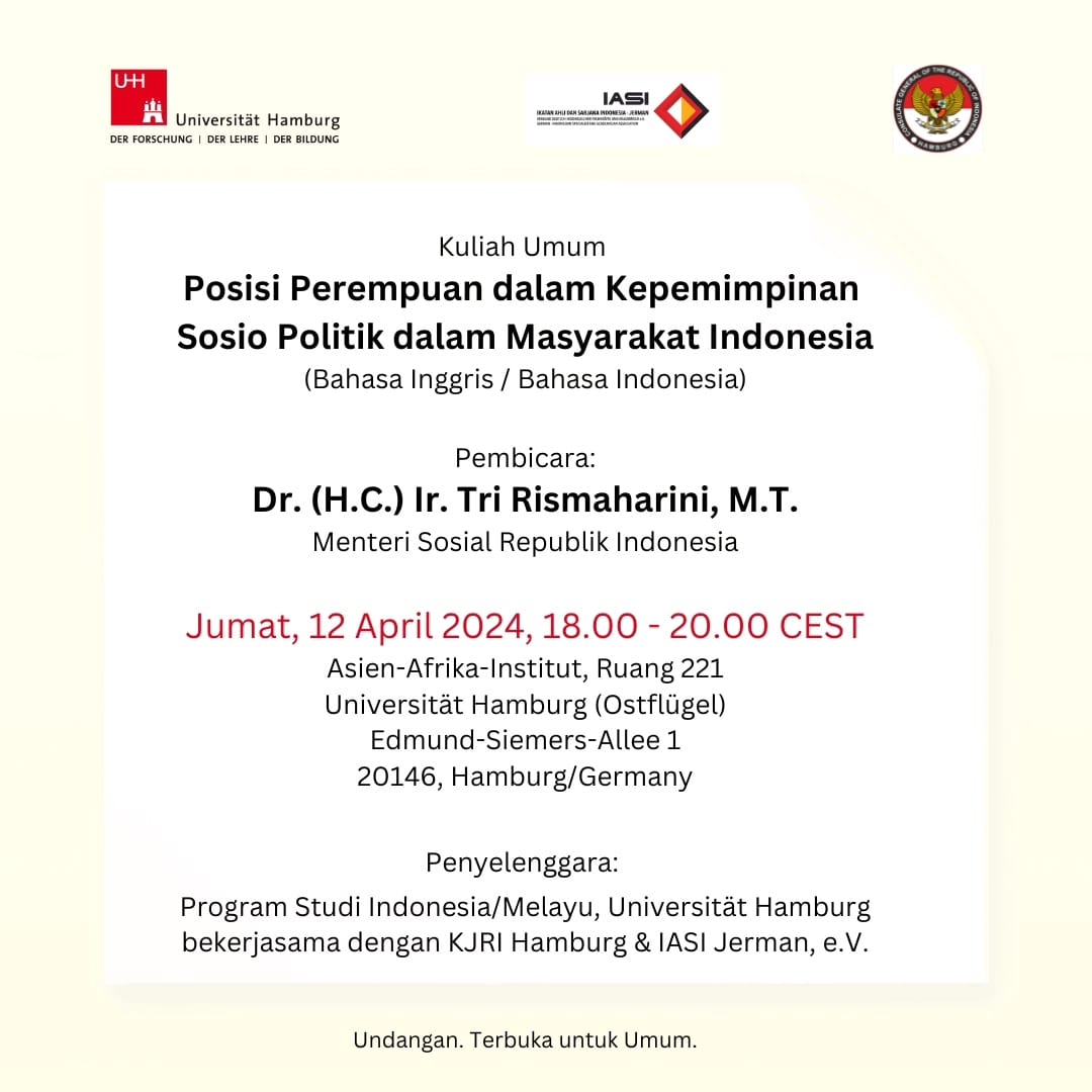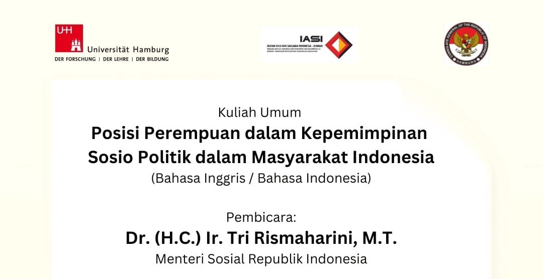 Zu Gast ist Dr. (H.C.) Ir. Tri Rismaharani, M.T., Ministerin für soziale Angelegenheiten der Republik Indonesien. Es geht um das Thema »The Position of Women in The Context of Social Political Leadership in Indonesian Society«.